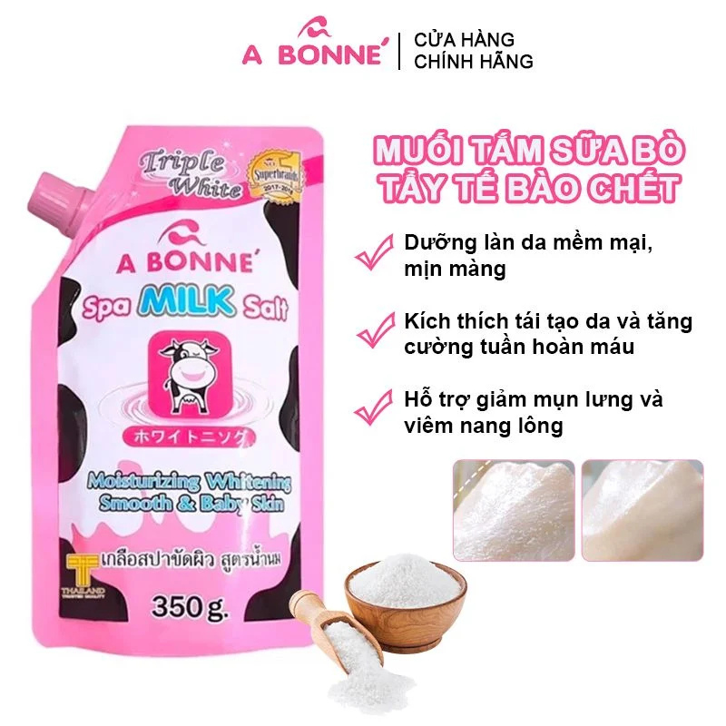 Muối Bò Bịch A Bonne là sản phẩm tẩy tế bào chết và làm trắng da tự nhiên đến từ thương hiệu A Bonne Thái Lan, được sản xuất từ sự kết hợp giữa muối tự nhiên, sữa và các thành phần khác. Sản phẩm được thiết kế để giúp mọi người có được làn da mịn màng và rãng rỡ bằng cách loại bỏ các tế bào chết và tạp chất sâu bên trong lỗ chân lông. Nó phù hợp với mọi loại da và có thể sử dụng trên khắp cơ thể.