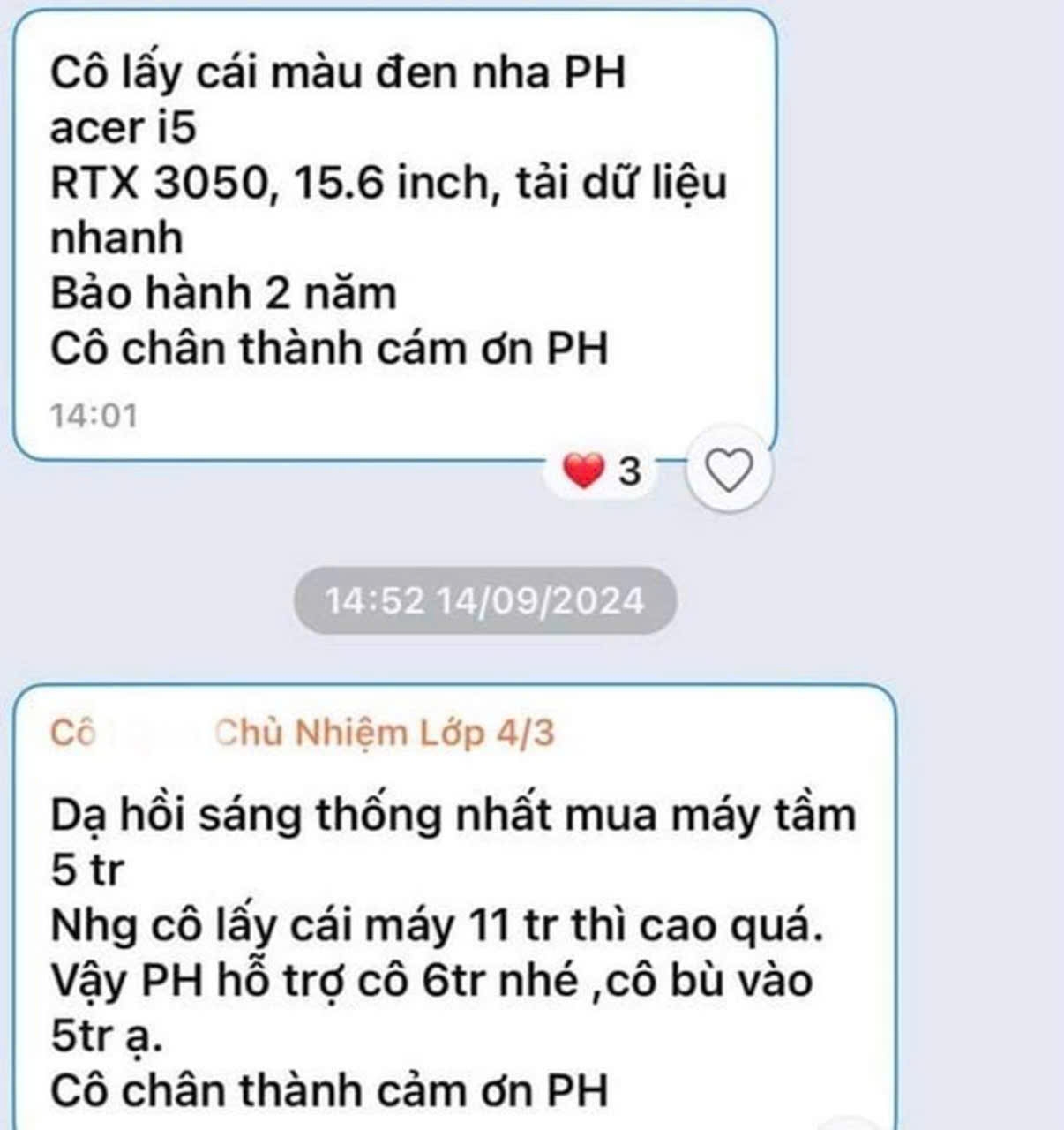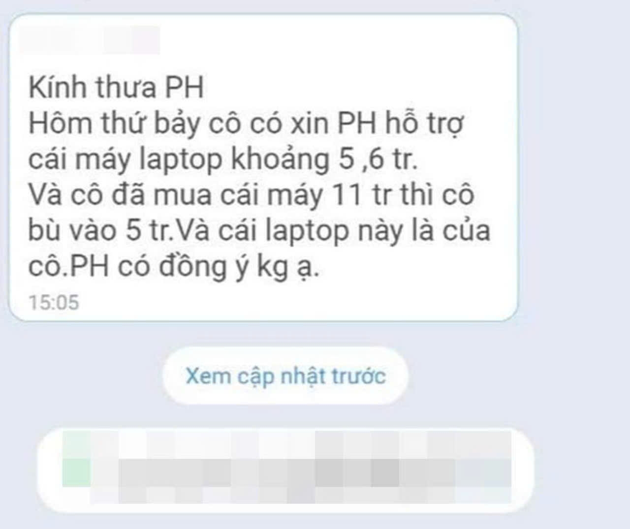Ngày 16/9, cô H tiếp tục nhắn nội dung: "Hôm thứ 7 (14/9), cô có xin phụ huynh hỗ trợ laptop khoảng 5 - 6 triệu đồng. Cô đã mua máy 11 triệu đồng thì cô bù vào 5 triệu đồng và laptop này là của cô. Phụ huynh có đồng ý không ạ?".