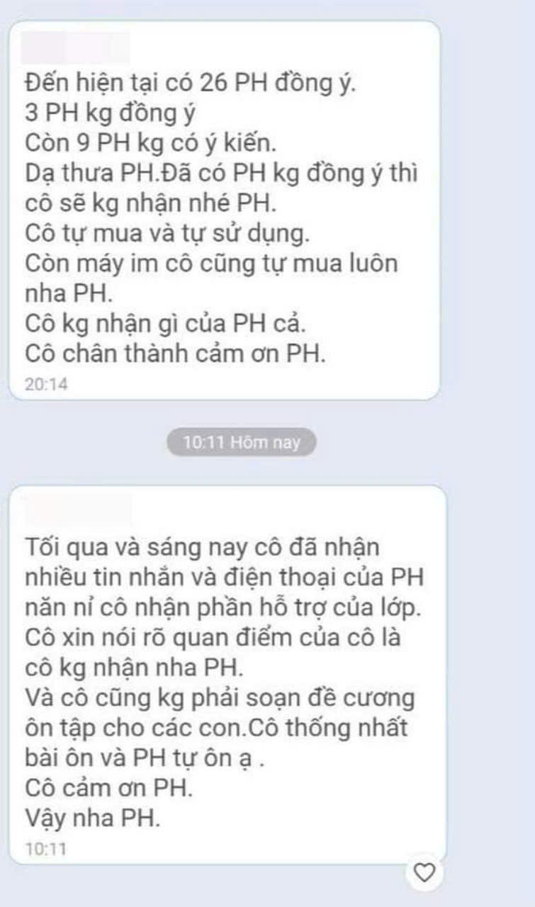 Đến ngày 17/9, cô H tiếp tục nhắn với nội dung: "Tối qua và sáng nay cô đã nhận nhiều tin nhắn và điện thoại của phụ huynh năn nỉ cô nhận phần hỗ trợ của lớp. Cô xin nói rõ quan điểm của cô là cô không nhận nha phụ huynh. Và cô cũng không phải soạn đề cương ôn tập cho các con. Cô thống nhất bài ôn và phụ huynh tự ôn ạ...".
