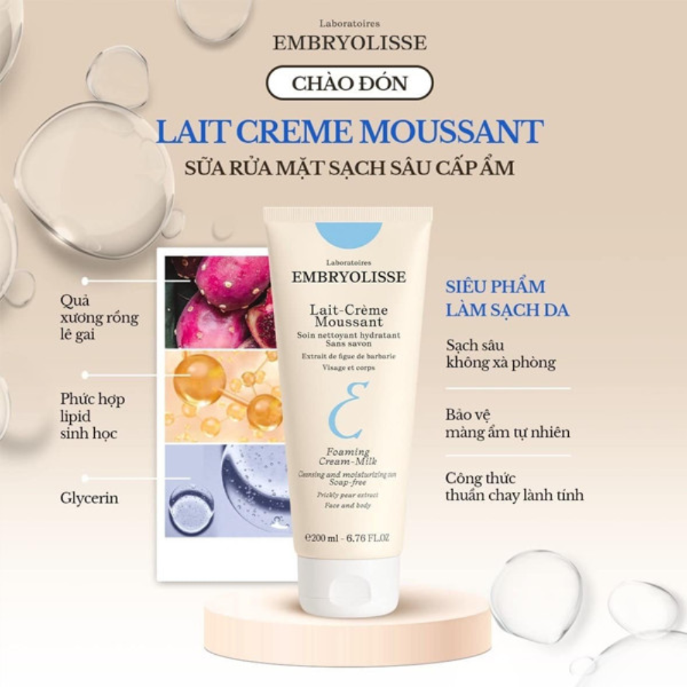 Sữa rửa mặt Embryolisse Lait-Creme Moussant là sản phẩm chăm sóc da mặt đến từ thương hiệu Embryolisse, xuất xứ từ Pháp. Sản phẩm này có khả năng làm sạch sâu, loại bỏ hiệu quả bụi bẩn và các tạp chất trên bề mặt da, đồng thời cung cấp độ ẩm cần thiết, giúp da mềm mại, tươi sáng và tràn đầy sức sống. Sữa rửa mặt Embryolisse Lait-Creme Moussant là lựa chọn ưu việt cho những ai muốn có một làn da khỏe mạnh và tràn đầy sức sống.