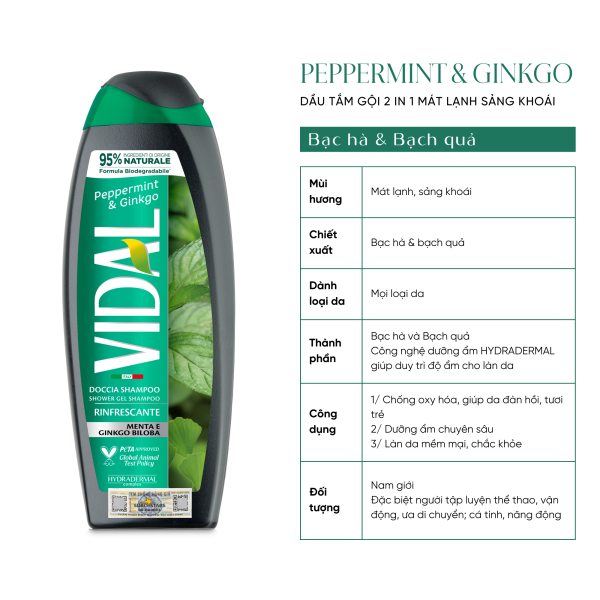 Dầu Tắm gội 2in1 mát lạnh sảng khoái (Vidal Peppermint & Ginkgo) mang tới hương thơm mát lành, trong trẻo từ Bưởi, gợn sóng từ bạc hà the mát kích thích bùng nổ mọi xúc giác. Tầng hương giữa được hoà quyện tinh tế hương thơm quyến rũ của Oải hương và xạ hương trắng. Hương gỗ kết hợp rêu sồi và hổ phách để lại hương thơm gợi cảm đến đắm say.