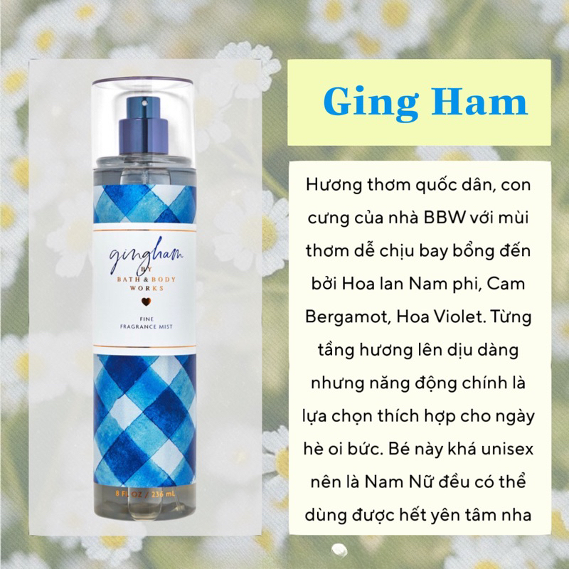 2: Xịt Thơm Toàn Thân Gingham Bath & Body Work 236ml nam nữ dùng được không? Dạ, Xịt Thơm Toàn Thân Gingham Bath & Body Work 236ml dùng được cho cả nam và nữ ạ.